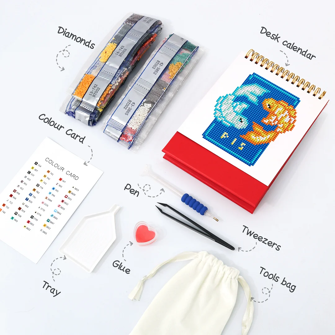 Elevate your desk with a year-long creative journey! This Diamond Painting Desk Calendar kit comes with 12 unique designs, one for each month. Enjoy the relaxing and rewarding process of creating art, then display your finished masterpiece in the elegant calendar stand. It's the perfect way to track time with a personal, sparkling touch.