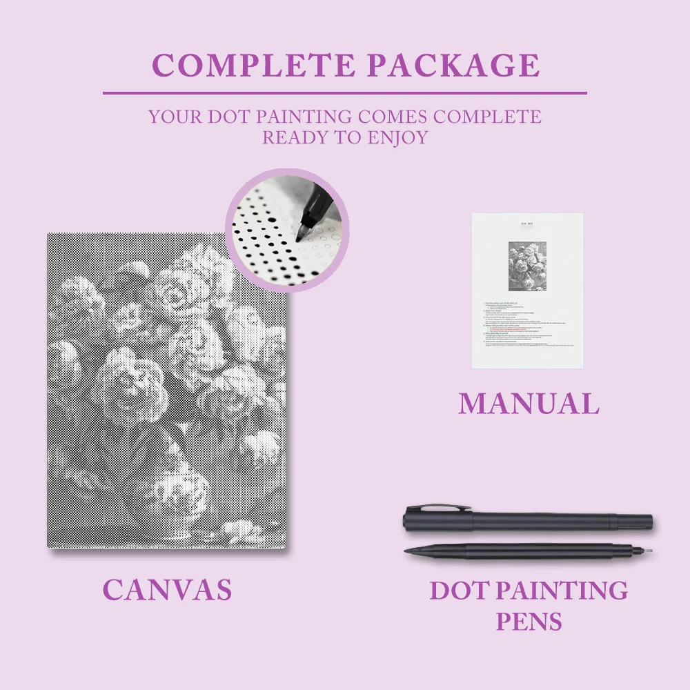 Pointillism is a timeless art form. What could be more relaxing than creating harmonious colors in a painting? And the final result is exquisite. The charm of pointillism lies in its lack of complicated rules or the use of various painting tools. Simply pick up the markers included with the pre-printed canvas and begin coloring.